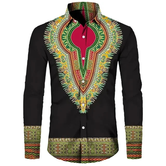 African Dashiki Collar Button Up Shirt Casual Long Sleeved Ethnic Style Street Shirt